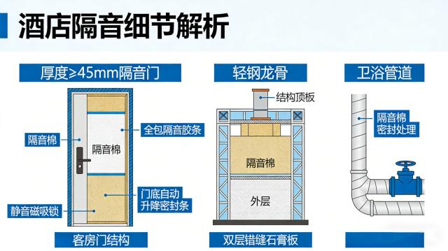 隔音细节,是入住体验的“第一道防线”,也是成都装修设计公司重点把控的核心环节。客人入住酒店,最核心的需求便是获得安静舒适的休憩空间,而室外喧嚣、走廊脚步声、隔壁交谈声、卫浴水流声,都可能成为体验的“绊脚石”。专业的成都装修设计公司会采用多重隔音方案:客房门选用厚度不低于45mm的隔音门,填充隔音棉并加装全包隔音胶条与门底自动升降密封条,搭配静音磁吸锁杜绝关门异响;隔墙采用轻钢龙骨+隔音棉+双层错缝石膏板结构,直通结构顶板,从根源阻断串音;卫浴管道全包隔音棉并做密封处理,有效隔绝水流共振产生的噪音,让客人远离干扰、安享静谧。