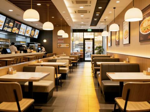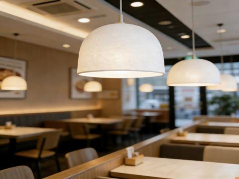 首先是照明设计,这是餐饮空间氛围营造的核心。在这组效果图中,我们能看到两种核心照明方式:嵌入式筒灯和悬挂式半球形吊灯。嵌入式筒灯作为基础照明,均匀分布在顶面,保证了整个空间的基础亮度,满足顾客通行、点餐、用餐的基础视觉需求;而半球形吊灯则作为重点照明,悬挂在餐桌上方,用柔和的漫射光聚焦用餐区域,既避免了强光直射带来的不适,又营造出温馨放松的局部氛围。这种“基础照明+重点照明”的双层照明系统,是现代餐饮空间的通用设计逻辑。对于快餐业态来说,照明设计还要兼顾运营需求:暖白色的色温(通常在3000K-4000K之间)既能提升食物的视觉吸引力,让餐品看起来更有食欲,又能营造出温暖的氛围,区别于传统快餐店的冰冷感;同时,灯具的选择还要考虑耐用性和易清洁性,适配餐饮空间的高频使用场景。