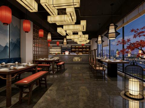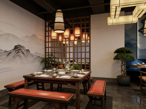 做减法的东方美学:拒绝满墙龙纹、复杂雕花,转而用极简的水墨山水、线性木格栅表达意境,避免厚重感,适配现代餐饮的轻快节奏。