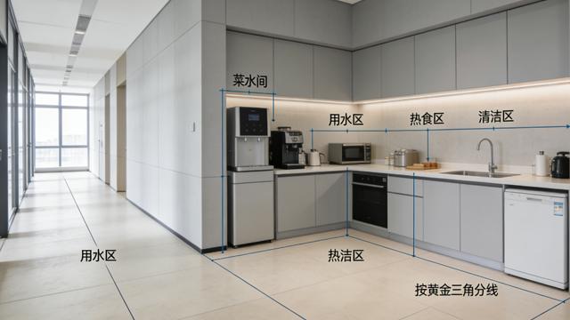 功能分区需围绕 “高频需求优先、分类清晰” 展开,避免冗余设计,同时预留扩展空间。取水区:配置 2-3 个多档位出水口(常温 / 热水 / 冰水),热水口加装防烫标识与儿童锁,台面选用 85cm 高度(适配多数人操作习惯),长度 1.2-1.5 米,台面下方预留漏水槽连接排水管,避免水渍蔓延。热食与储物区:设置 1-2 台微波炉、1 台冰箱,搭配 2 米长操作台面;储物区分公共与个人区域,公共层架 1.2 米高,上层放茶包、咖啡粉等消耗品,下层存清洁工具,旁设带锁柜存放桶装水与餐具;个人储物区配置 30cm×40cm×50cm 带锁小柜,贴编号存放个人水杯,柜内加装防潮垫。清洁区:配备分类垃圾桶、洗碗池与清洁池,地面做防水处理,排水坡度≥2%,选用哑光防滑地砖,便于日常清洁维护。若团队有带饭需求,可增设 0.8 米切菜台;希望提升协作属性,可放置折叠桌与可擦写白板,打造轻量交流区。
