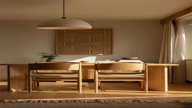 单一的原木容易让空间显得沉闷,通过材质碰撞可以瞬间提升高级感。在成都酒店的设计中,我们常用“原木+藤编+石材+布艺”的组合:藤编的通透、石材的冷硬、布艺的柔软,与原木的温润形成互补,让空间层次更丰富。比如客房中,原木床头搭配软包背景墙,既提升了舒适度,又让视觉更有层次;公区中,原木餐桌搭配藤编座椅,营造出松弛的用餐氛围。