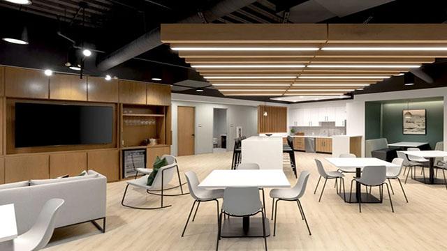 功能布局以 “开放共享 + 私密辅助” 为核心逻辑,实现空间价值最大化。休闲社交区以浅木色地板搭配浅灰软装,白色桌椅与黑色椅腿形成简约质感,吧台岛台兼顾员工简餐与临时洽谈需求;轻办公区与会议室通过玻璃隔断衔接,既保障采光通透,又平衡了开放与私密,低饱和度墙面与装饰画则贴合成都人对松弛感的追求。