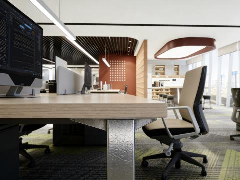 首先是照明设计。本次展示的办公空间采用了多层次的照明系统,结合了自然光与人工照明。大面积的全景落地窗引入了充足的自然采光,让办公空间明亮通透,不仅能提升员工的视觉舒适度,还能改善情绪、缓解疲劳。同时,搭配线性吊灯、筒灯等人工照明设施,根据不同区域的功能需求,设置不同的亮度与色温。比如办公区采用明亮的冷白光,保证阅读与操作的清晰;休闲区则选用柔和的暖光,营造放松的氛围。合理的照明设计,能避免强光直射或光线不足带来的视觉疲劳,打造舒适的视觉环境。