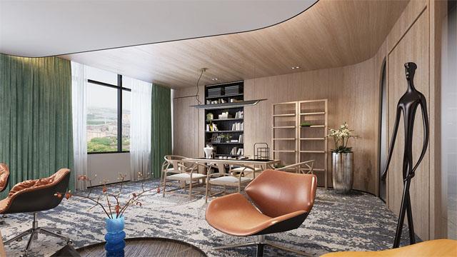 总裁室作为空间的核心,延续了原木轻奢的整体调性,通过深色木格栅、弧形玻璃与开放区形成软隔断,既保证了总裁办公的私密性,又实现了空间的通透感。大面积落地窗引入自然光,搭配休闲沙发区与茶台,将办公、接待、休闲功能融为一体,在风格统一的前提下,打造出专属的高端商务空间。