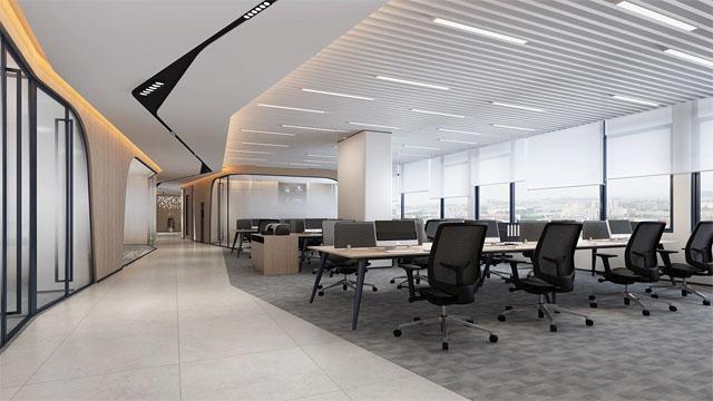 本案以温润原木为空间基底,贯穿开放工位、会议室、总裁室、洽谈区等全场景,通过弧形玻璃隔断、线性灯光、同色系软装,让整个空间形成视觉上的连贯性,避免了不同功能区的割裂感。开放办公区采用格栅吊顶 + 自然光设计,开放式工位布局搭配通透的弧形玻璃隔间,既保证了员工协作的高效性,又通过柔和的木饰面与地毯,营造出轻松舒适的办公氛围,让大平层的开阔感得到充分释放。