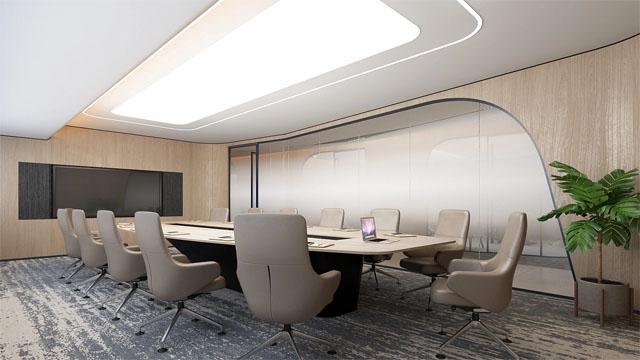会议室以弧形磨砂玻璃为隔断,既实现了与开放区的视觉联动,又保障了会议的私密性;悬浮式发光吊顶搭配同色系皮质办公椅,在延续原木风格的同时,强化了空间的商务感与仪式感,满足企业日常会议、商务洽谈的多元需求。