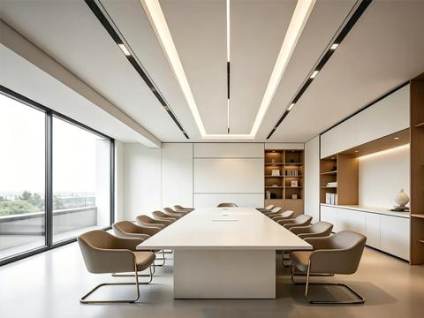 在功能规划上,我们充分考虑不同办公场景的需求。针对高管办公室,我们设计了一体化的收纳柜体与开放式置物架,兼具展示与收纳功能,同时利用隐藏式灯带打造柔和的间接照明,避免强光直射带来的视觉疲劳。开放工位区则采用模块化布局,以玻璃隔断划分区域,既保证了空间的通透感,又实现了工位的相对独立,配合统一的白色办公桌与人体工学椅,为员工提供高效的工作环境。会议室的设计则更注重仪式感与实用性,长条形会议桌搭配两侧的嵌入式储物柜,结合大面积落地窗引入自然光,打造出专业且开放的沟通场景。