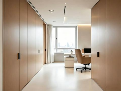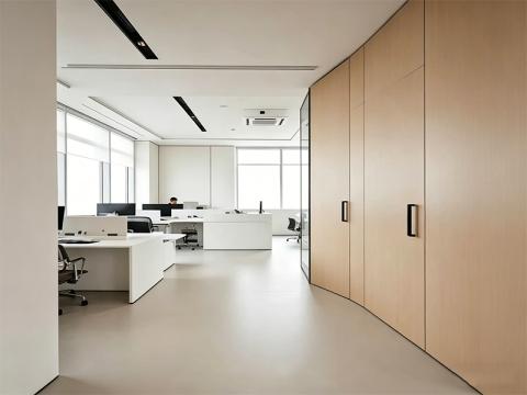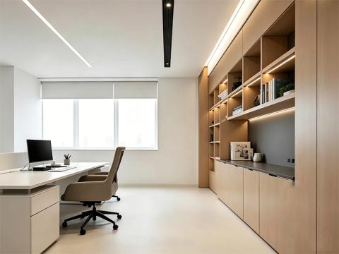 我们以现代简约的设计理念为核心,结合成都本地企业的办公需求,打造兼具实用性与高级感的办公空间。从总裁办公室的静谧私域,到开放工位区的高效协作,再到会议室的庄重专业,我们始终坚持以用户体验为导向,将木色与白色作为主色调,搭配无主灯线性照明系统,营造出通透、明亮且温暖的办公氛围。这种低饱和度的色彩搭配,不仅弱化了商业空间的冰冷感,更通过自然木纹的温润质感,缓解员工的工作压力,提升整体空间的舒适度。