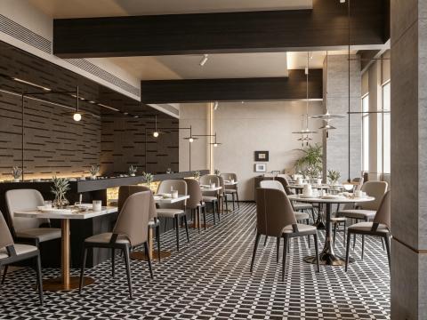 以本案成都餐厅为例,暖米色墙面+深木色顶面+黑白花砖地面,搭配金属家具与灯具,色彩层次分明,冷暖平衡,既高级又不冰冷,完美适配餐饮空间的氛围需求。