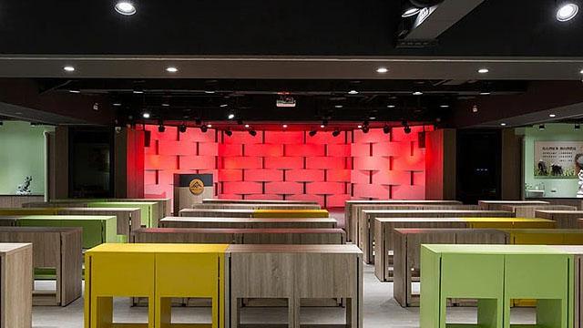 项目的核心亮点,在于可自由组合的模块化家具系统。展厅内的桌椅均采用标准化模块设计,可根据使用场景灵活拼接,既能组合成整齐的会议排座,适配企业培训、全员会议等场景;也可打散重组为小组讨论布局,满足头脑风暴、小型沙龙的需求;更能快速清空核心区域,打造路演、发布会的展示舞台。这种 “一空间多场景” 的设计,让原本仅能单一使用的展厅,实现了会议、路演、培训、活动等多种功能的无缝切换,大幅提升了空间的利用率与使用频次。