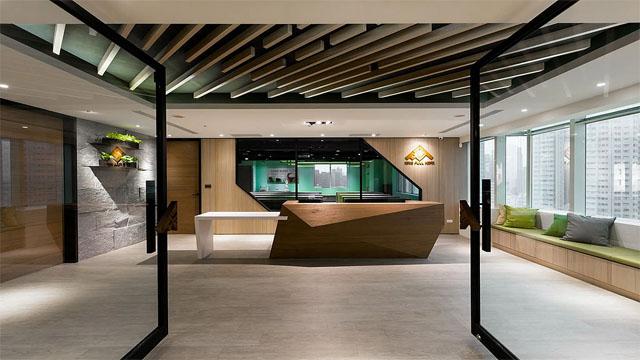 除了家具的模块化设计,展厅的声学与灯光系统也同步适配了多场景需求。背景墙采用立体声学模块,既优化了声场环境,也可通过灯光系统实现色彩变化,适配路演、发布会等多种氛围需求;裸露的工业风顶面搭配轨道灯,在保证照明均匀的同时,也能根据场景调整光线角度与亮度,为不同活动打造专属氛围。前厅区域延续了整体设计语言,几何切割造型的木质前台与玻璃隔断,与展厅形成功能联动,让接待与展示场景自然衔接,进一步释放了空间的使用价值。