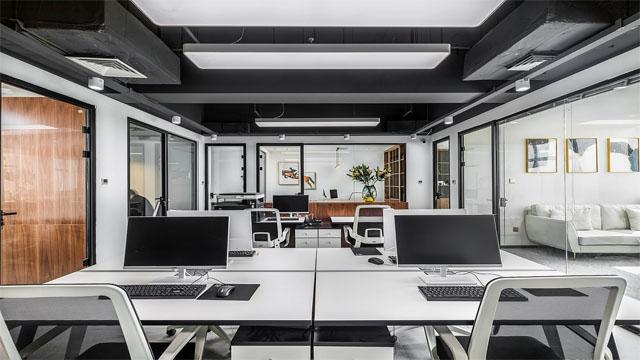 项目的工业质感,源于对材质与结构的大胆运用。裸露的黑色顶面搭配外露管线,奠定了利落硬朗的基调;大面积的通透玻璃隔断,在划分独立会议室与开放工区的同时,也保证了空间的通透感与采光,让原本略显冷峻的工业风多了几分轻盈与开阔。浅灰色地砖与温润的胡桃木饰面形成冷暖碰撞,既中和了黑色顶面的冷硬感,也通过材质对比提升了整体质感,让空间既有工业风的利落,又不失商务办公的沉稳。