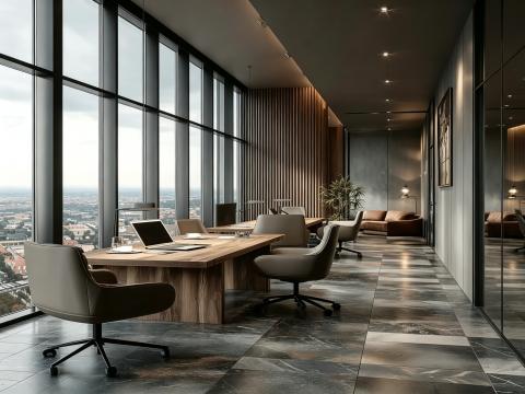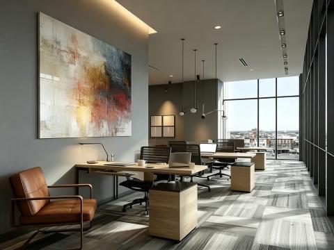 色彩搭配决定整体商务氛围,高端办公空间普遍采用低饱和度配色。以深灰、原木、黑色、米白为主基调,深浅层次有序,简约干净、沉稳内敛,不会浮夸张扬。墙面留白简约干净,局部搭配艺术挂画、软装摆件点缀空间,打破办公枯燥感。皮质座椅、木质家具柔和空间线条,让商务空间庄重得体,接待客户体面大气,内部办公舒适放松。